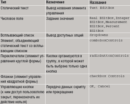 Объекты окна диалога имеют специфические методы и свойства. Например, checkbox имеет свойство, в котором хранится текст названия элемента управления (staticLabel) и состояние флажка (checkedState); содержимое всплывающего списка имеет свойство selectedIndex, которое показывает, какой элемент списка будет по умолчанию активным (занимающиеся дизайном веб-страниц найдут много общего с html-формами).