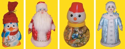 На смену им торопятся упаковки из пластмассы и пластизоля. Эти новички (если сравнивать время их пребывания на рынке с деревянными, жестяными и картонными упаковками) поражают воображение: Дед Мороз напоминает снегурочку, щедро оклеенную бородой, а островерхая, обтянутая псевдопарчой ёлка похожа на оружие ближнего боя. Давать ребёнку такую пику в руки не стоит — мало ли что он вздумает ею проткнуть! Изделие, романтично называющееся «Банка с крышкой "снеговик"» заставляет вспомнить голову профессора Доуэля. Голова снеговика венчает прозрачное тело, набитое конфетами. «Снегурочка, внучка большая» вмещает кило конфет. Вульгарное лицо внучки неуловимо напоминает её непутевую резиновую сестру из магазина для взрослых шалунов.