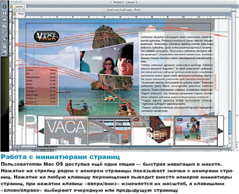 Программисты Quark наконец-то оглянулись вокруг в поиске и осмыслении того, что сделано другими разработчиками по совершенствованию интерфейса. В новой версии инструменты стали удобнее, а работа с ними — проще. Многие действия с объектами похожи на те, что годами проверены в программах Adobe Photoshop и Illustrator, — работа с пером, поворот объектов, изменение размера из центра и пр. В панели измерений появилось поле с информацией об эффективном разрешении иллюстрации. Раньше, чтобы с нею ознакомиться, надо было подгружать отдельное расширение. Решена давняя проблема — несоответствие ожидаемого и реального номеров страницы, когда их размер на экране близок к миниатюрам: берёшь в буфер картинку, щёлкаешь в окне по пиктограмме с. 20, помещаешь в макет содержимое буфера, а оно оказывается на с. 21! В новой версии алгоритм определения страницы усовершенствован, описанной ошибки больше нет.Значительно усовершенствован инструмент работы с направляющими. Можно создавать их как для мастер-страницы, определяя координаты линий, цвет, процент отображения, начиная с которого линии видны на экране и т. п., так и для рабочей страницы/разворота. Работа идёт с текущей страницей или разворотом — команда «Окно•Направляющие» откроет окно, в котором отображены текущие направляющие из мастер-страницы и добавленные именно на этот разворот. Можно копированием переносить направляющие с других страниц на текущую. Выделив нужные направляющие на текущей странице, добавьте их на мастер-страницу — они появятся на всех страницах проекта.