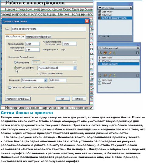 Раньше текст помещался только в текстовый бокс, а теперь импортируется в любой выбранный. Если не выбрано ни одного, программа сделает бокс на текущей полосе и поместит туда текст. В меню шрифтов теперь каждый шрифт отображается своим начертанием. Инструмент «Текст по контуру» изъяли из меню за ненадобностью — теперь достаточно сначала нарисовать контур, а потом щёлкнуть по нему новым инструментом «Текст». Известный факт — всех, кто хотел пользоваться привязкой текста к базовым линиям, расстраивало, что в макете есть только одна сетка. Забудьте об этой проблеме — в новой версии можно задать сетки как для шаблонных страниц (при выбранной шаблонной странице: «Страница•Направляющие и сетка шаблонных страниц»), так и из контекстного меню («Настройки сетки») для конкретного текстового бокса. На вкладке «Настройки текста» есть поля «Размер шрифта» и «Межстрочный интервал», а рядом отображается значение «Интерлиньяж =» как сумма чисел из этих полей. На вкладке «Настройки отображения» можно выбрать цвет и запрет/разрешение отображения верхней, центральной, базовой и нижней линий. Значение, введённое в поле «Размер шрифта», определяет расстояние между верхней и нижней линиями. По сути, это ширина полосы, в которой будет размещена одна строка текста, если выбрана привязка к базовым линиям бокса, а значение, введённое в поле «Межстрочный интервал», — это расстояние между нижним и верхним краями двух соседних полос. Положение базовой линии шрифта между верхней и нижней линиями можно указать на вкладке «Настройки текста» или выбрать значение из метрик одной из гарнитур. При подготовке сеток для шаблонной страницы регулируйте количество строк на полосе. Настройки сеток сохраняются как отдельные стили.