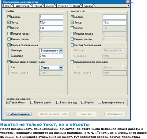 До 8-й версии функции поиска и замены были применимы только к тексту. Теперь можно искать графические объекты в макете: «Правка•Поиск и замена элементов». Условия поиска задаются отдельно для блоков, рамок, линий, рисунков. Очень полезна вкладка «Сводка», в которой собрана вся информация о заданных условиях поиска/замены. Только почему-то забыта возможность указывать стиль объекта как объект поиска/замены. Наверно, это будет в очередном обновлении программы…