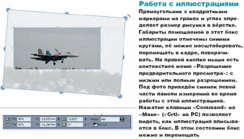 Как и с текстом, неважно, какой бокс выбран перед импортом иллюстрации. Если ничего не выбрано, будет создан бокс для размещения картинки. Импортируются файлы EPS, TIFF, PSD, PDF, AI. Восемь узловых точек бокса с иллюстрацией — это маленькие белые квадраты. Помещённая в бокс картинка имеет 8 синих кружков в узловых точках. Находящийся вблизи одного из белых квадратов курсор изменяет вид, предлагая изменить размер или повернуть бокс с содержимым. Какая операция будет выполняться, ясно по виду курсора. Если выбран один из синих кружков, то обрабатывается только картинка, бокс неподвижен. Для продолжения обработки содержимого иллюстрационного бокса надо выбрать инструмент «Содержание рисунка» и щёлкнуть мышкой по этому боксу. При масштабировании рисунка в панели измерений отображается величина его эффективного разрешения.