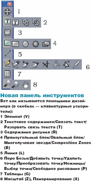 Работа с инструментом «Перо» стала такой же, как в Illustrator. Импортированные картинки можно перетаскивать с полосы набора в Photoshop и Illustrator для их редактирования. Толщина рамок, наклон бокса и картинки в нём, цвет линий, фона и пр. сохраняются как стили объекта.