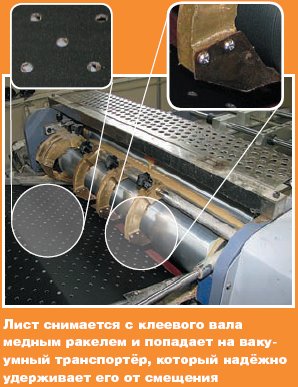 На покровный материал клей наносится в «печатной паре» за счёт прижима листа к клеевому валу прижимным валом. С помощью секционного ракеля голова листа отделяется от клеевого вала, захватывается вакуумным транспортёром, и лист поступает для дальнейшей обработки.