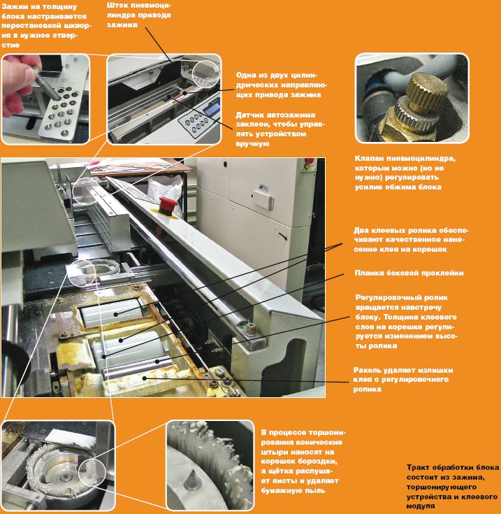 Интересен способ борьбы с загрязнением стола остатками клея. Обычно стараются не допустить его попадание на стол, и в машинах высокого уровня не промазывают клеем по несколько миллиметров корешка у его верхнего и нижнего торцев. Однако это усложняет конструкцию (клеевая ванна должна перемещаться по высоте) и настройку на заказ (придётся каждый раз задавать длину блока).