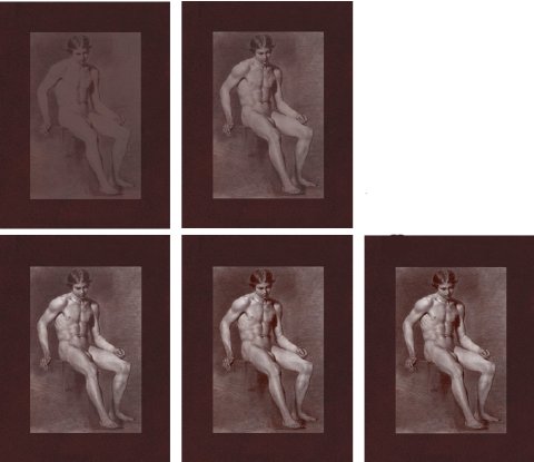Нашей студией разработана техника объёмной печати, имитации химического травления на стекле, а использование серии красок с разной дисперсностью пигмента позволило напечатать полутоновое изображение фотографического качества. Основное преимущество способа: в отличие от поверхности обычного стекла, прошедшего стандартную химическую обработку, на напечатанной картинке в процессе эксплуатации не остаётся отпечатков пальцев, что немаловажно при использовании изделия в составе кухонной и комнатной мебели. Роль подложки в изображении играет тёмно-коричневая кожа. Печатаем от прозрачного цвета к более плотному, после чего для контрастности наносим коричневый полупрозрачный цвет, собираем напечатанное изделие и паспарту в рамку.