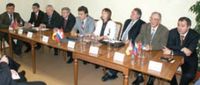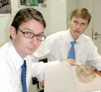 М. Байер (manroland): «Мы видим перспективу в России и для машин большей полосности. Три 48-полосных Lithoman — это только начало». Справа на снимке: О. Румянцев (H.G.S)