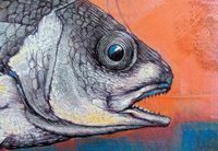 После высыхания краски бумагу срезали с планшета и пропустили через струйный принтер. Размер срезанного листа с рисунком должен точно соответствовать размеру эскизного отпечатка, иначе не добиться совмещения печатной графики и нарисованных деталей фона. Для этого при переводе изображения мы отметили контуры эскизного принтерного отпечатка. Затем по этим меткам обрезали ватманский лист, предназначенный для печати. Послепечатная обработка: несколькими движениями широкой кисти придали динамику фону, тонким колонком дорисовали плавники. Законченный графический лист закрепили акриловым лаком |