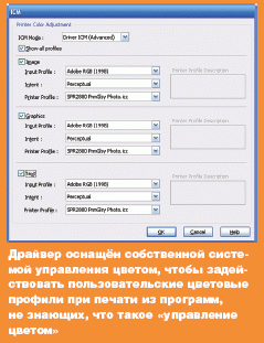 С принтером поставляется комплект ПО, который я не стал устанавливать, зная о его возможностях по другим моделям. Исключение– драйвер, без которого не поработаешь. Он значительно усовершенствован и заслуживает небольшого описания. Порадовало изменение работы с пользовательскими настройками, в которых хранятся параметры печати. Раньше в одном наборе хранились все параметры— тип бумаги, разрешение печати, формат и ориентация листа, а для переноса их на другой компьютер приходилось вводить всё заново. Теперь настройки разделены на два уровня. На первом параметры, относящиеся к качеству печати: название бумаги, разрешение, настройки системы управления цветом. На втором— настройки макета печати: формат, ориентация, масштабирование и пр. Все настройки можно экспортировать в файл и перенести на другой компьютер. Ещё одно нововведение— надпечатка рядом с изображением (на том же листе) имён задания и пользователя, даты, времени и режима печати. Конечно, при печати фото без полей функция вряд ли будет востребована— она полезна при выводе пробных отпечатков вместе с контрольными метками и шкалами.