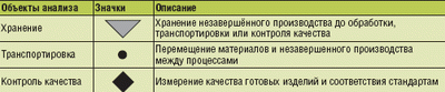 Заранее подготовьте и всегда имейте под рукой схему расположения оборудования и рабочих мест. По оборудованию она наверняка в каком-то виде существует: проверьте её актуальность и добавьте рабочие места. Нанесите на схему значки (см. таблицу), соедините линиями, укажите направление и способ перемещения продукции, расстояние между пунктами. В местах хранения отмечайте количество «незавершёнки». Не стремитесь к идеальной точности — можно указывать диапазоны. На этом этапе важно увидеть процесс целиком и понять, где могут прятаться потери.