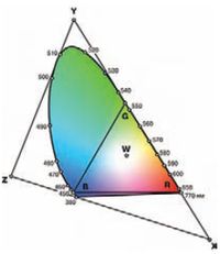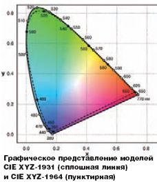 Основана на экспериментальных данных, независимо полученных Гилдом и Райтом. Пространство цветов стандартного колориметрического наблюдателя CIE 1931 г. было сформировано путём перенесения системы координат базовых цветов R (700 нм), G (546,1 нм) и B (435,8 нм) в абстрактную систему координат трёх воображаемых цветов X, Y и Z. Модель официально признана во всём мире, но имеет ряд недостатков. При длине волны 380–460 нм суммы цветовых координат слишком малы. После дополнительных исследований CIE в 1964 г. приняла новую XYZ-модель стандартного наблюдателя. Так как представляемые в ней данные хорошо коррелировались со старыми, было решено рекомендовать обе модели: старую для оценки небольших по размеру цветовых образцов (приблизительный угол поля зрения 2°) и новую для больших образцов. Цветовую модель XYZ также можно использовать для нахождения цветностей различных источников света и стандартных световых излучателей.