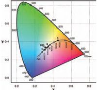 Особое значение для колориметрии имеет стандартный источник света E с равноэнергетическим спектром излучения, который не существует в природе и соответствует идеальному гипотетическому источнику белого света. Его цветовые координаты (x = 1/3; y = 1/3) обозначаются на графике CIE т. н. точкой белого цвета. Остальные излучатели, поскольку их спектр не является строго линейным, располагаются вокруг неё.