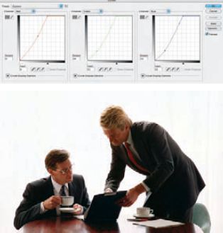 Осталось сделать подходящую маску, чтобы не затемнять людей и стол. Лучшие маски всегда получаются из самых контрастных каналов. В данном случае — из синего. Добавляем к тёмному слою пустую маску и копируем в неё синий канал, например, при помощи команды Apply Image в пунк-те меню Image. При помощи кривой делаем маску (именно маску, а не сам слой) темнее — так, чтобы силуэты людей стали совсем чёрными.