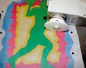 Недавно представленный печатающий УФ-чернилами гибридный принтер Mimaki показала «Русском». Одна из главных особенностей 4-цветного UJV160 (макс. ширина полотна 1610 мм, макс. разрешение 1200 dpi) — отверждение красок с помощью двух светодиодных ламп. Производительность при разрешении 600×900 dpi и печати в двунаправленном режиме 7 м2/ч, макс. толщина запечатываемого материала 10 мм. На стенде «Смарт-Т», хорошо известной разработками в области прямой цифровой печати на текстиле, — созданная специалистами фирмы модификация широкоформатного принтера Mimaki JV33-160 для печати по текстилю. Новый JV33-Tx (макс. разрешение 1440×1440 dpi) предназначен для прямой печати по полиэстеровым (полиэфирным) тканям дисперсными и сублимационными чернилами. Сохранена печать по сублимационной бумаге для дальнейшего термопереноса нанесённого изображения на ткани. В числе наиболее часто запечатываемых и популярных тканей названы тафет, флажная сетка, атлас, габардин. Технология прямой печати позволяет добиться 100-процентного прохождения чернил сквозь ткань при сохранении хорошей яркости цвета. В состав плоттера включены системы моторизованной размотки и намотки ткани, обеспечивающие постоянное натяжение полотна с помощью грузовых натяжителей и сервоприводов с оптическими датчиками обратной связи. Кювета для сбора прошедших сквозь ткань чернил установлена в подкареточном пространстве. Первичный нагреватель, позволяющий удерживать требуемую температуру, отвечает за предварительную просушку ткани, исключающую смазывание чернил на изнаночной стороне ткани.