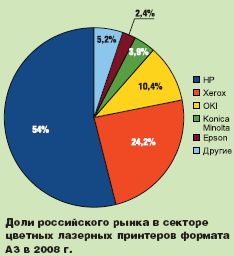 По данным «IDC Россия» в 2008 г. в России продано 6342 цветных лазерных принтера формата А3 (без учёта устройств Canon iRC, которых было продано 420 шт. — проходят по категории МФУ, включая продажи в принтерной конфигурации; а также аппаратов RISO HC5500). Это примерно на 5% меньше результата 2007 г. — первый спад после многолетнего роста, что не удивляет, учитывая суровые реалии. Вряд ли стало сюрпризом и падение продаж в I кв. 2009 г. более чем втрое относительно аналогичного периода 2008 г. — 564 единицы против 1796. А у производителей продолжает задавать тон «большая тройка», упрочив позиции: в сумме на HP, Xerox и Oki в 2008 г. пришлось 88,6% (86% в 2007 г.). Ведущий аналитик «IDC Россия» по рынку периферийных устройств Алина Селивёрстова отметила: «Даже во втором полугодии 2008 г. и в I кв. 2009 г. в корпоративном сегменте все цветные устройства показывали лучшую динамику относительно того же периода прошлого года, чем ч/б, — рост в III кв. и меньшее падение в IV кв. 2008 г. и I кв. 2009 г. Главных причин две: цветное оборудование приобретается под конкретные цели, когда оно действительно необходимо; не все поставки такого оборудования можно было отменить или отложить с такой же лёгкостью, как ч/б. Что касается динамики по форматам, то в цветных устройствах формата А3 (где велика доля закупок для конкретных проектов и кампаний) падение поставок в IV кв. было меньше, чем устройств А4, но в I кв. 2009 г. поставки цветных лазерных устройств А3 сократились сильнее, чем ч/б. Ожидается, что тенденция сохранится до конца года. Изучая соотношение «МФУ против принтеров», мы видим: в сегменте цветных лазерных устройств А3 после небольшого «всплеска» в III кв. 2008 г. доля МФУ снизилась до 41% (уровень II кв. 2008 г.) и оставалась стабильной в двух последних кварталах. Для сравнения: доля МФУ в секторе цветных А4 увеличилась в IV кв. и немного снизилась в I кв. 2009 г., а доля ч/б А3 МФУ продолжала увеличиваться начиная с IV кв. 2008 г., и только среди ч/б лазерных устройств А4 доля МФУ постоянно снижалась со II кв. 2008 г. Главным образом потому, что именно в последнем сегменте (А4 ч/б) чувствительность к цене наиболее высока, и покупатели с относительной лёгкостью отказывались от многофункциональности».