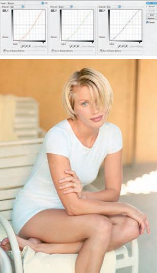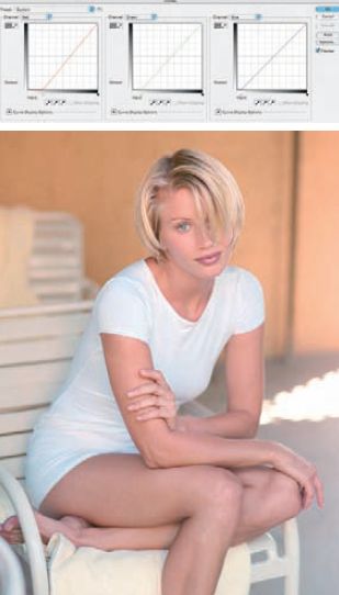 Достаточно найти на белом объекте самую светлую точку, где ещё есть значимые детали, и откорректировать — убрать «лишние» составляющие (например, при помощи кривых). Фото сразу станет намного чище. Но белых объектов здесь несколько — платье (или это просто длинная майка?), полотенце, кресло. Если предположить, что белое именно полотенце или кресло, то у фотографии останется лёгкий голубоватый оттенок. Пусть лучше нейтрально-белым будет платье (или это всё же майка?), а полотенце и кресла станут молочно-белыми. Для получения нейтрального цвета в RGB все три составляющих (значения в красном, зелёном и синем каналах) должны быть равными. В CMYK значения для пурпурной и жёлтой составляющих равные, а для голубой — на 5-10% выше.