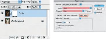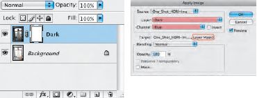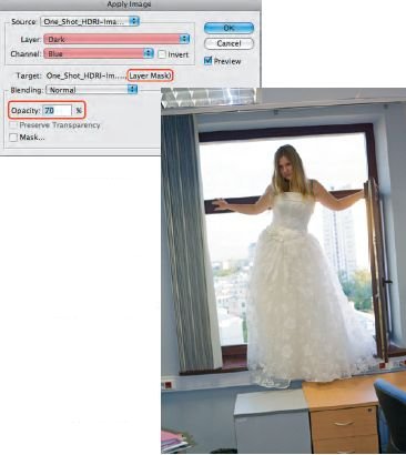 Тёмный вариант в виде слоя переносим в файл со светлым вариантом (с нажатой <Shift> один слой точно совместится с другим). Создаём маску для тёмного слоя и командой Apply Image копируем в неё синий канал тёмного слоя. В синем канале выше всего контраст между комнатой и улицей, поэтому на его основе и делается маска. Благодаря «натуральной» маске (а не нарисованной вручную) переход от тёмного слоя к светлому будет плавным.