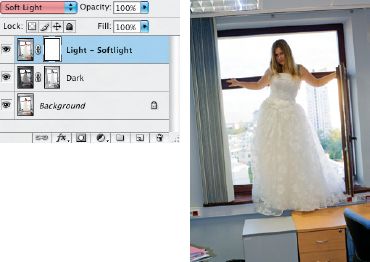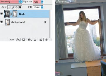 Диапазон стал шире, но потеря контраста в средних тонах сделала фото неестественным. Переводим тёмный слой в режим Multiply (это сделает тени насыщеннее). Подбираем для него подходящее значение Opacity — 70%. Фото смотрится более естественно, однако по-прежнему не хватает контраста. Делаем копию светлого слоя, назначаем для неё режим наложения Soft Light (мягкого повышения контрастности). Света и полутона в норме, остаётся только смягчить контраст в тенях. Для этого создаём маску верхнего слоя и копируем в неё синий канал со всего изображения (при помощи функции Apply Image). Подбираем подходящую степень прозрачности маски — 70%.