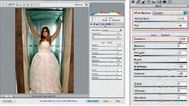 Ещё один пример из той же фотосессии. Девушка стоит в дверях лифта, передний свет — галогеновые офисные лампочки, контровой — более яркие лампы дневного света в лифте. Снова начнём с RAW-файла со «светлыми» настройками (большее значение параметра Exposure). Заодно подкорректируем в нём цветовую температуру так, чтобы убрать оранжевый оттенок с платья и со всего фото. Обратите внимание: внутренности лифта окрасились в зелёный цвет. К нему вернёмся чуть позже. Теперь создаём файл с «тёмными» настройками. Цветовая температура — без изменений, As Shot.
