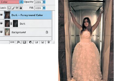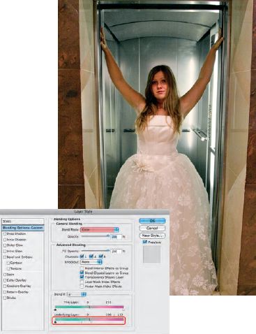 Внутренности лифта перестали быть зелёными, но на всём остальном пространстве фото этот слой надо скрыть. Самый удобный способ — Blend If… (условное наложение слоёв в панели Blending Options). Передвинув белый треугольник влево, скрываем слой везде, где нет зелёного цвета. Чтобы эффект был более плавным, разъединяем половинки треугольника, удерживая <Option> (<Alt>).