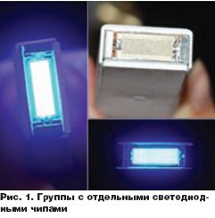 Светодиодные УФ-системы высокой мощности компонуются из групп отдельных полупроводниковых светодиодных чипов, т. н. матриц (рис. 1) размером 1×1 мм2 при отдаче 0,5 Вт на устройство. В принципе, компонуя матрицы «шахматкой», реально получить плотность потока излучения в 50 Вт/см2 — больше, чем с дуговыми лампами.