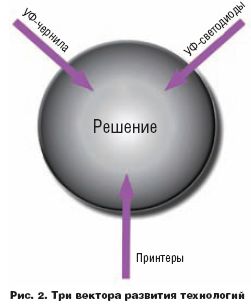 Светодиодная УФ-индустрия в сотрудничестве с производителями принтеров и поставщиками красок успешно работает над реализацией всех трёх задач. Адаптация, вероятнее всего, будет проходить локально, определяясь целевыми сферами применения принтера и наличием соответствующих УФ-чернил. Пока интеграция светодиодного отверждения идёт в сегменте малопроизводительных принтеров с небольшой шириной печати. Для них мощность, плотность излучения и стоимость элементов системы отверждения уже достигли оптимальных значений. В течение ближайших пяти лет, по мере совершенствования технологии в трёх указанных направлениях, мы станем свидетелями интеграции светодиодных систем УФ-отверждения в более производительные и технологичные модели принтеров (рис. 2).