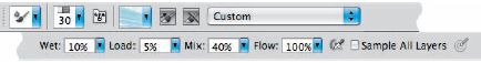 В зависимости от настроек цвета могут смешиваться на сухом холсте, влажном, мокром и очень мокром. Поле Wet отвечает за поведение фона при рисовании — сухую краску фона вы просто зарисуете, а мокрую кисточка «потащит» за собой, создавая более или менее реалистичные мазки. Load — скорость «высыхания» кисточки, Mix — степень смешения краски, в которую обмакнули кисточку, с изображением на фоне. Нажатые кнопки Load и Clean позволяют, соответственно, автоматически обмакивать кисть в краску и смывать её после каждого мазка. В панели Tool Options есть набор готовых настроек (presets), но все параметры задаются и вручную.