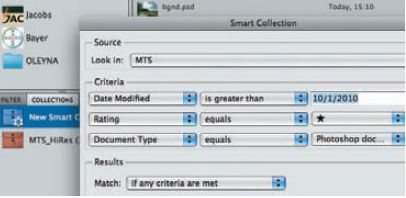Чрезвычайно гибко реализован поиск файлов. В Bridge учтены все нюансы, встречающиеся в повседневной работе с изображениями, особенно касаемо фотографий. Тут и все виды EXIF-данных, поиск по ориентации, разрешению, цветовому профилю, физическим размерам, соотношению сторон и многому другому. Результаты поиска сохраняются в виде именованных наборов в панели Collections, туда же можно помещать необходимые документы (например, мастер-файлы) и самостоятельно. Предусмотрены и Smart Collections — фактически это наборы запомненных параметров поиска, что позволяет не тратить время на их повторное перечисление.