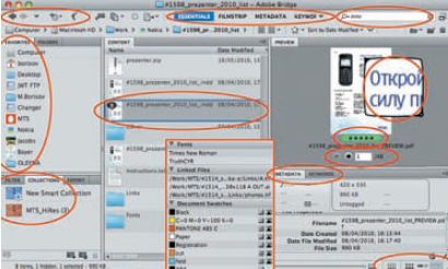 И для специалистов по препрессу Bridge — настоящая находка. Быстрый просмотр основных технических параметров макета сводит количество «факапов» к минимуму. Параметры выводятся согласно заданному шаблону (Preferences/Metadata), сконфигурированному под конкретные задачи. Кроме традиционных форматов JPEG, TIFF, можно просматривать сниппеты InDesign, постранично PDF-документы, в AI — каждую рабочую область Artboard, а также EPS, PS, PSD; и всё это с возможностью увеличения, просмотром количества сепараций и использованных образцов цвета (swatches), шрифтов, цветового профиля, разрешения, физических размеров, для вёрстки ещё и отображение связанных файлов… Супер!