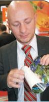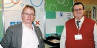 Другие чернила Чернила от SEPIAX Ink Technology получили EDP Awards-2010 неспроста. Они не содержат сольвентов, а лишь 30% воды. Частицы специальной смолы с пигментами полимеризуются при нагреве. Получается своеобразное УФ-отверждение без УФ. На выходе имеем возможность нанесения изображений с помощью печатающих головок Epson DX3 и DX4 практически на любые поверхности. В России чернила завезли люди со снимка: Мартин Дуда (слева) представляет SEPIAX, а его российский партнёр Александр Подкопаев руководит фирмой «Диджипром». |