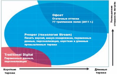 Основные сферы — печать книг и журналов. Естественно, конфигурация зависит от конкретного приложения и пожеланий заказчика. В центре графика — та область, на которую ориентирована машина. Она способна взять на себя часть из огромной массы 77 триллионов страниц плюс то, что может печататься с использованием «цифры». Поэтому на Prosper перекочуют как офсетные, так и цифровые тиражи.