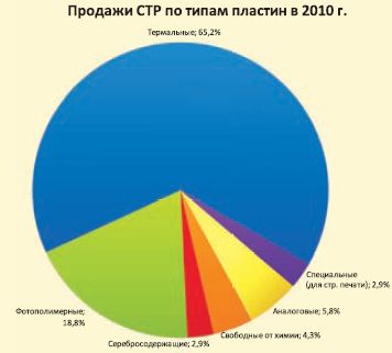 Доля CTP для «обычных» термальных снизилась до 65,2%, но ещё больше потеряли фотополимерные — осталось 18,8%. Зато на третью позицию вышли CTP для аналоговых пластин — 5,8%. Возобновились поставки CTP для пластин, свободных от химии (4,3%). Не иссох ручеёк аппаратов для серебросодержащих пластин (2,9%), хотя это б/у системы. Есть и экзотическое новшество — специальные металлические пластины для струйных CTP (2,9%). На самом деле доля систем в секторе «свободные от химии» заметно больше: по политическим соображениям похожие решения от Fujifilm позиционируются как «малохимические», или low-chem. Пока мы поместили их в таблицу в графу «фотополимерные».