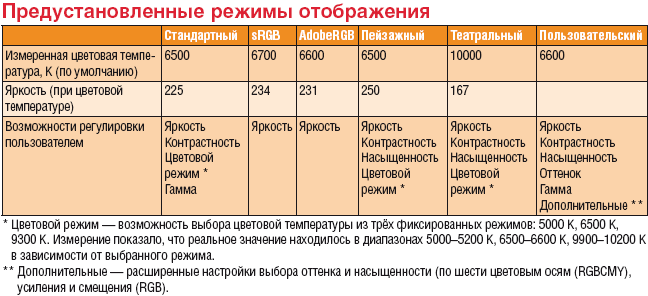 Предустановленные режимы вывода изображения отличаются цветовыми охватами, параметрами «по умолчанию» и возможностями регулировки. Некоторые сведения собраны в таблицу.В пейзажном и театральном режимах активизируется фирменный «улучшатель» Splendid с «задранными» контрастом и насыщенностью. Возможно, они подойдут для просмотра видеофильмов, но обработка изображений в них противопоказана.