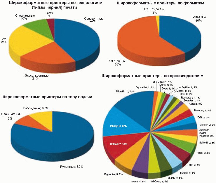 Что касается форматов, то соотношение между «средне-» и сверхширокоформатными (более 3 м) моделями — 60 на 40. Год назад в категории «более 3 м» было 27% машин, и целых 4,8% пришлось на принтеры менее 1 м шириной.