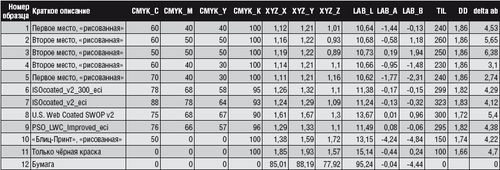 Первое место со светлотой L = 10,6 делят рисованные плашки 1 и 5 с TIL = 240. Последняя (70-40-30-100) выглядит по оттенку, как и плашка 4 — «воронье крыло». Но по тоновому отклонению (красная кривая на графике) заметно, что оттенок приближен к оттенку тиражной бумаги: строго колориметрически выходит, что 5-й отклоняется от бумаги меньше всех. По абсолюту он не нейтрален, но баланс полутонов в печати мы тоже держим не по абсолюту: на жёлтой бумаге абсолютный баланс полутонов будет визуально синить, на синей — желтить. Небольшое увеличение TIL (240) всего на 10 единиц относительно плашки 4 только за счёт голубой краски обоснованно дало уменьшение светлоты.
