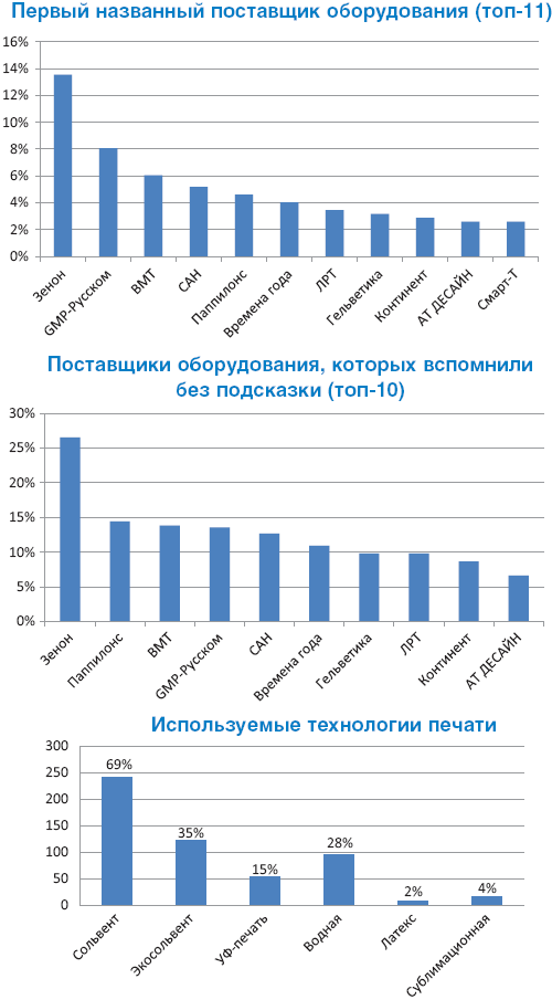 Осенью 2011 г. по заказу редакции Publish был впервые проведён масштабный опрос, посвящённый российскому рынку широкоформатной печати (ШП) и охвативший почти все регионы — около половины респондентов работают за пределами Москвы. В нём приняли участие 393 компании, из которых 88% имеют собственное оборудование, 7% размещают заказы на ШП по субподряду в других компаниях, а 5% планируют открыть это направление. Чтобы обеспечить максимальную объективность, мы гарантировали респондентам конфиденциальность их анкет — все цифры обрабатывались в обезличенной форме. Результаты опроса представлены в виде диаграмм и комментариев к ним. Для наглядности в большинстве случаев мы ограничивали количество позиций первым десятком.