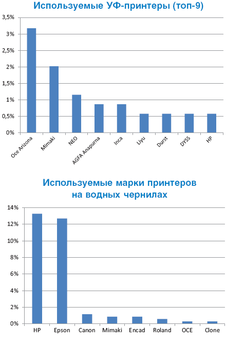 Следующая диаграмма иллюстрирует степень проникновения технологий ШП с точки зрения применяемых чернил. Сольвентная — по-прежнему самая распространённая, её используют 69% респондентов. Популярность устройств на экосольвентных и водных чернилах вполне ожидаема, а вслед за ними, хотя и заметно уступая, следует УФ-печать. Слабы позиции принтеров на Latex, но для HP это скорее хороший знак — есть большой потенциал развития. Как и для сублимационной печати — многие поставщики считают это направление крайне перспективным. Сумма не равна 100% — у многих респондентов установлено несколько принтеров на разных технологиях.