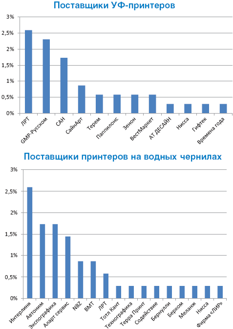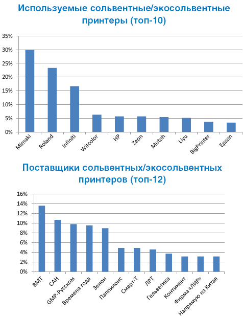 Наиболее массовая группа принтеров, используемых на производстве, — сольвентные и экосольвентные. Мы объединили их и построили две диаграммы — по маркам и поставщикам.