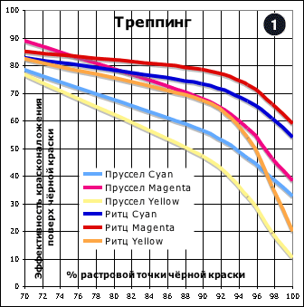 Хотя в офсете практически не бывает ситуаций, когда нужно ограничивать чёрную краску менее 100%, я всё же предпринял попытку поискать осмысленное обоснование для BIL < 100. Использовалось два метода поиска: прямой и косвенный. Во-первых, я искал закономерности в падении контраста в определённых точках BIL при разных TIL; во вторых, искал изменения в функции треппинга — эффективности красконаложения триадных красок поверх чёрного с различным BIL. Изменение (перелом) функции треппинга в одной из трёх типографий косвенно подтвердило, что после прохождения границы BIL = 94 треппинг ухудшается (рис. 1), однако падения контраста при этом в точке BIL = 94 или соседних в целом для разных TIL не происходит. Иными словами, я не получил надёжных экспериментальных данных, подтверждающих, что ограничение BIL с какой-то закономерностью влияет на локальные контрасты в тенях. Никакого приоритета, например, BIL = 95 перед BIL = 100 обнаружить не удалось: по всем тестам контраст в глубоких тенях не падает на границе BIL = 95 или какой-то иной. На трёх из десяти вариантов цветоделения теней было выявлено характерное падение контраста (рис. 2) в районе BIL = 94, однако 7 других вариантов этого скачка не подтвердили. Дополнительно проведённый печатный тест также не подтвердил закономерностей: функция контраста для всех шкал не идеально гладкая, всегда немного разная, и локальные контрасты сохраняются вплоть до BIL = 100. Поговаривают, что при архиогромной площади запечатки и большом количестве воды BIL < 100 может быть как-то обоснован, хотя разумнее было бы просто убавить подачу воды, нежели ограничивать BIL. Ограничение BIL < 100 увеличивает светлоту чёрной точки и тем снижает общий контраст (динамический диапазон) оттиска.