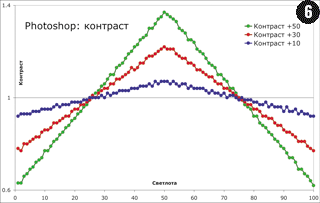 Результатом печати и промеров 12-ти равноконтрастных контрольных шкал (12 вариантов цветоделения) стали графики на рис. 5 (на следующей странице). Изучался не весь светлотный диапазон оттиска, а лишь тени (именно на них оказывает влияние TIL, BIL и UCA). Тут требуется небольшой комментарий. Зелёными точками показана «идеальная» функция локальных контрастов, рассчитанная по формуле DE2000. Тонкими красными кривыми обозначено, как в действительности повели себя локальные контрасты на печати при вариантах цветоделения. Толстой коричневой кривой обозначена сглаженная полиноминальная тенденция (trend) — производная от функции локальных контрастов. Очевидно, что в идеале красная, коричневая и зелёная кривые должны совпадать. Чем больше между ними различия, чем выше скачки красной кривой — тем хуже передаточная характеристика (линейность) процесса, тем больше оттиск отличается от задуманного на экране. Надо понимать, что скачки вверх на красной кривой ничем не лучше скачков вниз: функция контраста такова, что если на одном участке тонового диапазона что-то прибыло, значит, на другом участке убыло. Одно дело, когда мы осмысленно управляем процессом, например, в Photoshop изменяем контраст: мы видим, как локальные контрасты в полутонах растут за счёт падения на краях тонового диапазона — в светах и тенях (рис. 6). Если же локальные контрасты меняются в печати непредсказуемо и эти изменения не учтены в профиле цветоделения и на цветопробе (на практике к такому может приводить нелинейость формного процесса, отклонение растискивания от предполагаемого в процессе печати), то и результат получаем непредсказуемый.