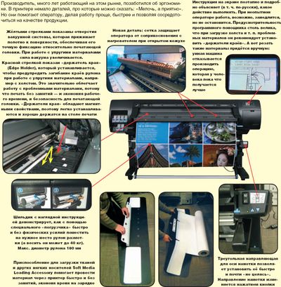 Механическая часть латексных DesignJet основана на «старом» принтере HP DesignJet Z6100. Такая унификация, надо полагать, полезна при производстве и, возможно, сервисном обслуживании. Основное отличие в наличии двух нагревателей (на стадии закрепления и сушки) и их программном управлении. У принтера DesignJet L28500, который только что поступил в продажу, на пульте управления – не кнопки, как у модели 26500, а сенсорный экран.