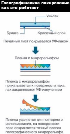 Суть технологии: после нанесения сплошного слоя лака оттиск попадает в секцию нанесения рельефа. Там к нему прикладывается непрерывная прозрачная плёнка с заранее выгравированным рисунком-матрицей. Этот «бутерброд» подсвечивается ультрафиолетом, и лак мгновенно затвердевает, запечатлевая на оттиске форму матрицы с плёнки.