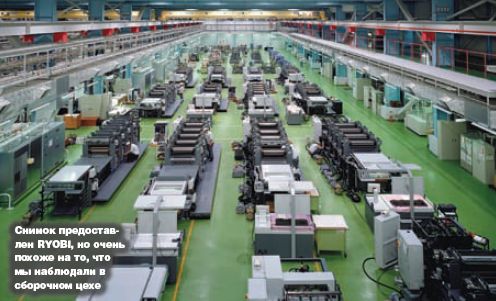 Печатное оборудование Ryobi производится на трёх заводах. Самый современный, Hiroshima East Plant, был открыт в 2000 г. и явно строился с прицелом на выход в полный формат. Здесь выпускают машины А2, А1, B2 и B1. Значительная часть площади завода занята литейным производством — основным бизнесом группы Ryobi: на литьё приходится 73%, а на полиграфоборудование 12%. Продажи машин в 2011 финансовом году принесли компании 20 млрд йен (примерно 200 млн евро по текущему курсу). Это вдвое меньше, чем в рекордных 2007—2008 гг. Но в сравнении 2010 г. налицо небольшой рост.