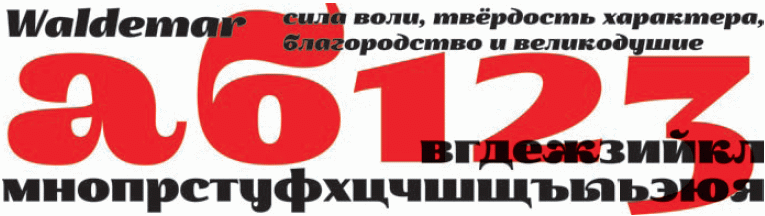 Немецкое имя Вальдемар, по мнению дизайнера Сергея Ткаченко, хорошо отражает характер букв. Шрифт мощный, мужественный, но одновременно мягкий и добрый. Рисунок знаков широкий, плотный, со скромными выносными элементами и большими каплями. Шрифт содержит более чем 1600 знаков, поддерживает латиницу, кириллицу и греческий. Имеет несколько наборов цифр и специальные символы. Предназначен для акциденции и коротких текстов. Разработан в 2011 г.