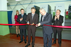 | Заместитель Премьер-министра Беларуси Владимир Потупчик (2-й справа) и директор KBA по продажам Свен Стржельчик перерезают красную ленточку |