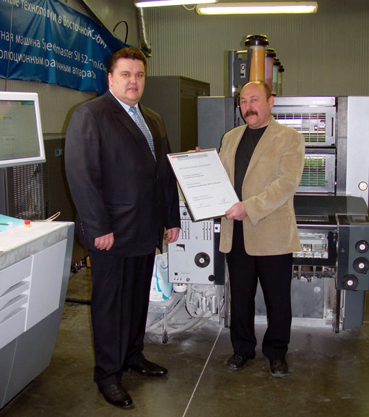 Руководитель межрегионального центра Сибирь, Дальний Восток и Монголия «Гейдельберг-СНГ» Максим Епифанцев вручает акт приёмки – передачи оборудования директору «Репроцентр А1» Сергею Макарову