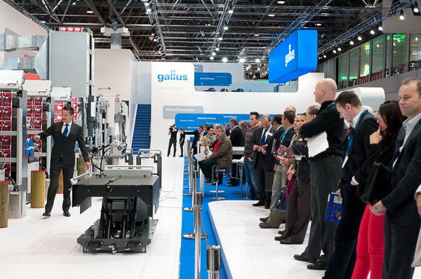Gallus довольна итогами участия в Drupa 2012 и сообщает, что за 14 дней выставки презентации системы Gallus ICS 670 посетили 8 тысяч человек. Оборудование, предназначенное для поточного производства высококачественных картонных коробок, к выставке оснастили секцией глубокой печати и модулем холодного тиснения фольгой. Кроме того, на стенде площадью 720 м2 были представлены решения, повышающие эффективность производства складных картонных коробок и изделий из картона, высокопроизводительные системы Gallus для изготовления объёмной упаковки. Кроме того, компания демонстрировала возможности ротационной трафаретной печати с использованием сеток Gallus Screeny. Эффективность производства в линию предлагали повысить с новой системой 100% контроля качества, дополненной автоматическим выталкиванием заготовок на плоском высекальном прессе Gallus FCL.