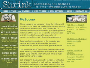 В начале июня более 50 общественных экологических организаций Европы запустили совместный проект Shrink, призванный бороться с чрезмерным и необдуманным потреблением бумаги. На сайте можно дать обязательство потреблять меньше бумаги и придерживаться простых правил её экономии, увидев, несколько при этом снизится влияние на окружающую среду: отказаться от рекламных листовок и рассылок, распечатывать только действительно нужные документы, выбирать двустороннюю печать. За первые недели посетители сайта торжественно пообещали сэкономить 34 т бумаги.