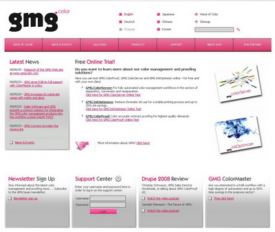 Специализирующаяся на высокотехнологичных системах управления цветом и цветопробных решениях GMG обновила корпоративный веб-сайт. Поменяв дизайн и структуру, компания добавила веб-демонстрации ключевых продуктов — GMG ColorServer (цветоделение и преобразование данных), GMG InkOptimizer (сокращение объёма краски), GMG Proofing (цветоделение и цветопроба). Серьёзно обновлён раздел поддержки пользователей.