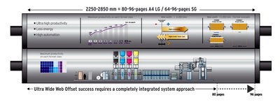 В фокусе проекта Ultra Wide Web Offset — анализ технических параметров сверхширокой рулонной печати с сушкой, рекомендации по экономике предприятия и методикам работы. Новые коммерческие машины сверхширокого формата (до 2850 мм) печатают до 96 полос на бумаге в машинном и поперчном направлениях. Их потенциальные преимущества — крайне высокая производительность при меньшей себестоимости оттиска, выгодность инвестиций по сравнению с группой машин меньшего формата, высокая автоматизация в комплексе с низким энергопотреблением. Среди достоинств по сравнению с традиционными машинами глубокой издательской печати — более сжатые сроки и меньшая стоимость офсетных форм.